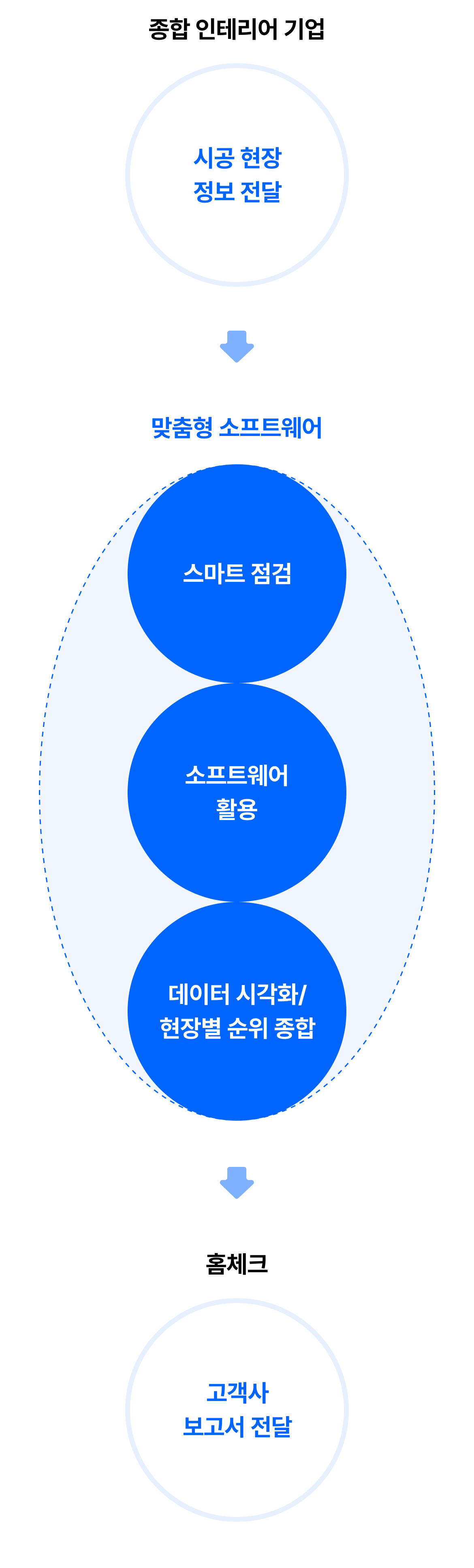 전국의 수 많은 대리점을 통해 인테리어, 리모델링을 제공하는 종합 인테리어 기업 입장에선 일관된 시공품질을 제공하는 것이 핵심 포인트입니다. 홈체크는 각 현장의 품질을 관리하고, 여러 공정의 시공품질을 확인하여 일관된 시공 결과물을 제공할 수 있도록 점검하고 있습니다.